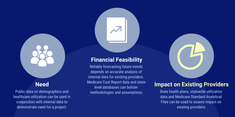 Certificate of Need (CON) requirements vary by state, but many require applications to address three main topics: need, financial feasibility, and impact on existing providers. This is the third and final part of this three-topic series. This blog post discusses data sources to address the impact on existing providers of a CON-reviewable project.