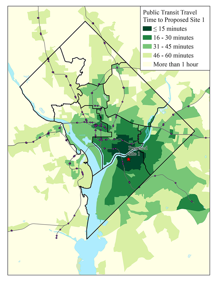 RPC has used Esri to compare access to health care facilities by public transit or private car. The map below shows how RPC used ArcGIS to analyze travel time by public transit to possible clinic locations in Washington DC. RPC used transit time information from Google Maps to show transit time to specified locations in fifteen-minute increments.