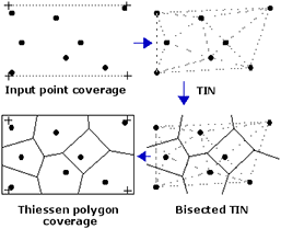 Esri calculates the polygons by first inputting all points into a triangular irregular network (TIN). A TIN is a form of vector-based digital geographic data made of a set of vertices connected with edges to form a network of triangles.[19] Next, Esri generates the perpendicular bisectors of each triangle in the TIN network, which form the edges of the Thiessen polygons. The vertices of the polygons are determined based on the intersection of the bisectors.[20]