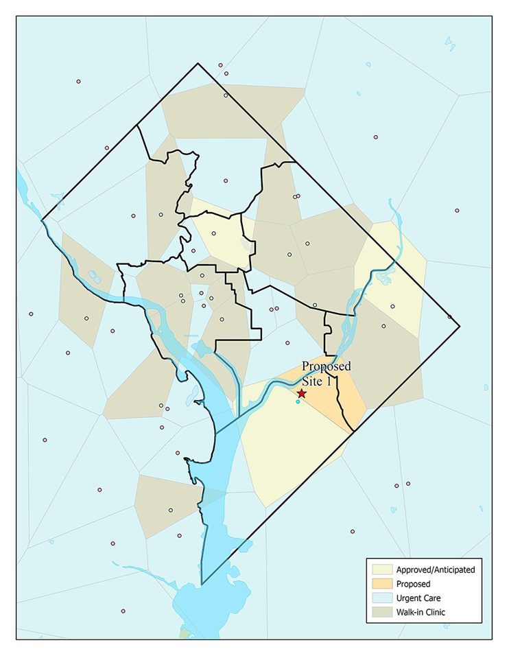 RPC used Thiessen polygons to help a client show how a proposed facility could improve geographic accessibility of services. The map below uses color-coded polygons to show the area geographically closest (by straight-line distance) to certain health facilities in Washington DC and surrounding areas. The polygons are color-coded by facility type. This way, each polygon shows the facility type as well as the area closest and more geographically accessible to the dot it surrounds than any other site.
